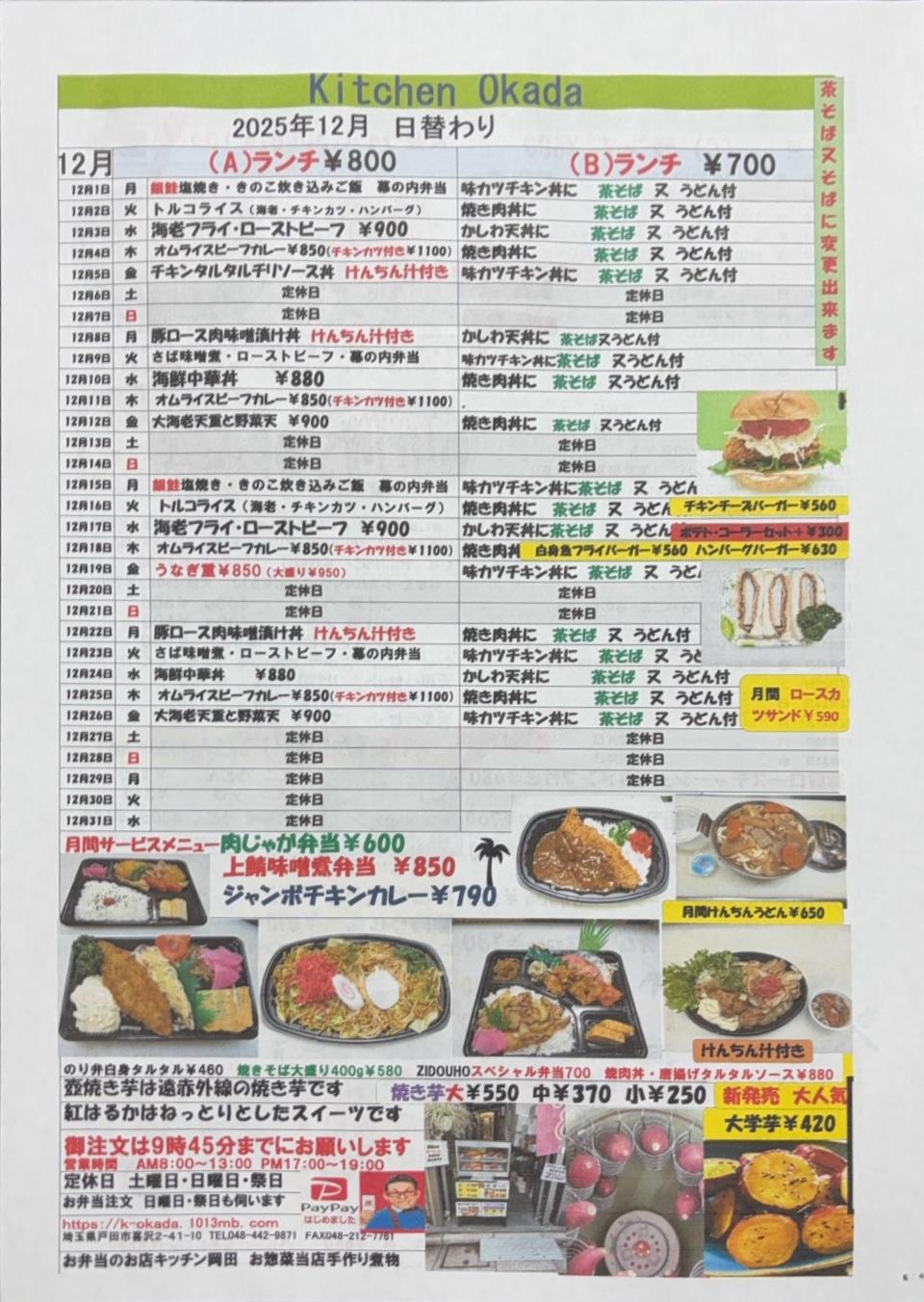 2025.11.28 お知らせ 12月の日替わりランチメニュー admin Aランチ 800円、Bランチ 700円 Cランチ 600円 ランチのご注文は、9時45分までにお願いします。 ABOUT ME キッチン岡田